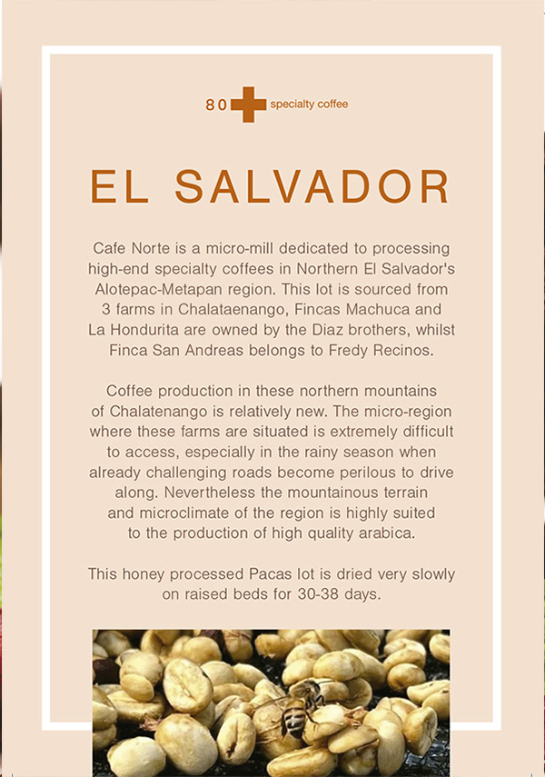 Café Norte is a micro-mill dedicated to processing high-end specialty coffees in Northern El Salvador’s Alotepac-Metapan region. This lot is sourced from three farms: Machuca and La Hondurita (owned by the Díaz brothers) and San Andres (owned by Fredy Recinos). Coffee production in these mountains is relatively new, but the microclimate and challenging terrain are perfect for growing high-quality arabica. This honey-processed Pacas lot is slowly dried on raised beds for 30–38 days.